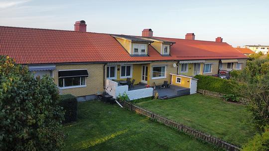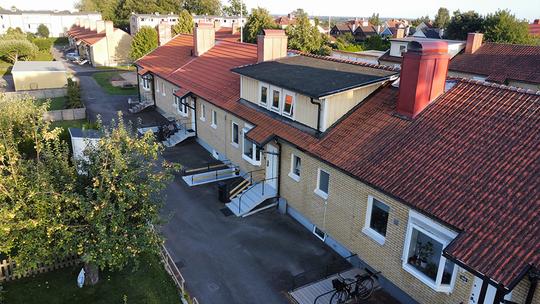 Bostaden är en av kvarterets 50 radhusfastigheten, som alla har äganderätt. Husen byggdes 1947-1948 och var initialt en bostadsrättsförening (Riksbyggen Skövdehem nr 7). Efter 30 år fick fasaderna dess nuvarande gula tegelbeklädnad, och fastighetens friköptes av bostadsrättsinnehavarna, och därför bildades också den nuvarande samfälligheten för att handha de gemensamma ytorna mellan husraderna.